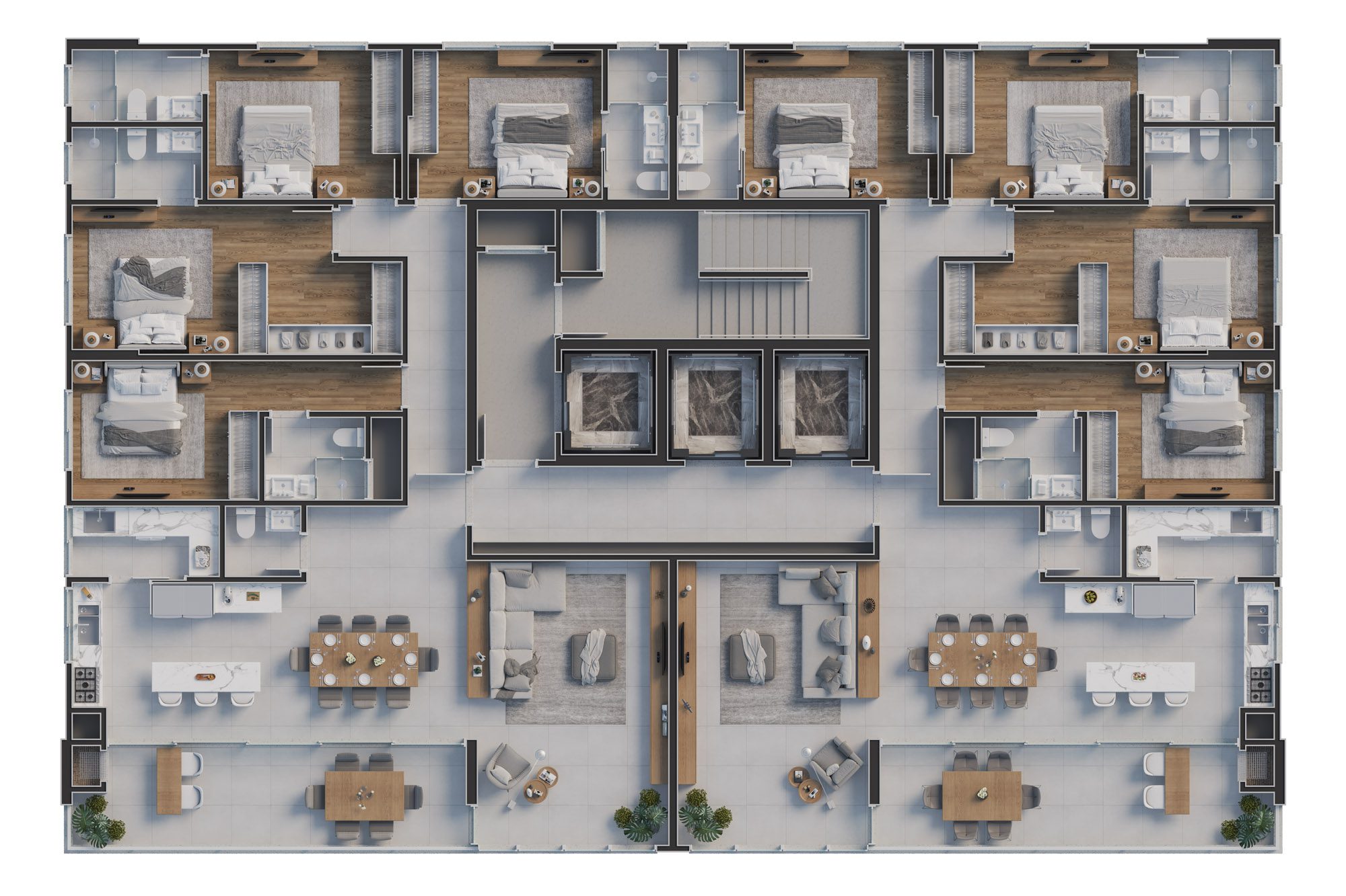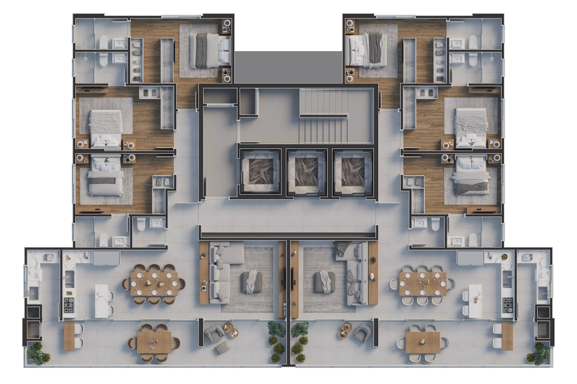 Com 2 torres imponentes, o Grand Mistral Towers oferece opções de plantas com 3 a 4 suítes, com áreas privativas que variam de 140 m² a 170 m². Cada torre conta com 24 andares, distribuindo 2 apartamentos por andar, garantindo total privacidade e exclusividade aos seus moradores.
